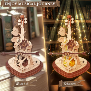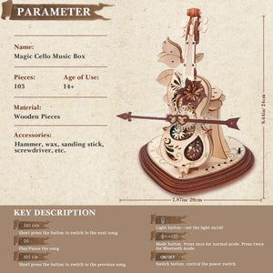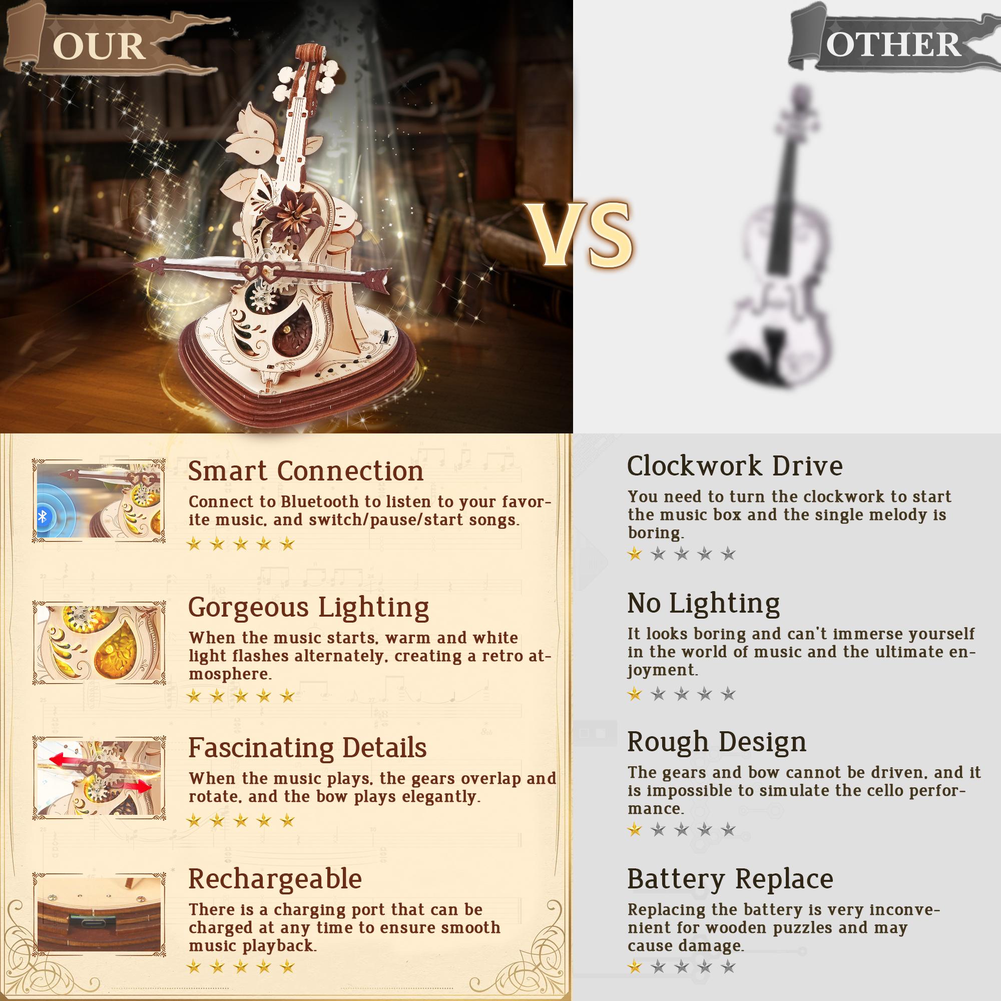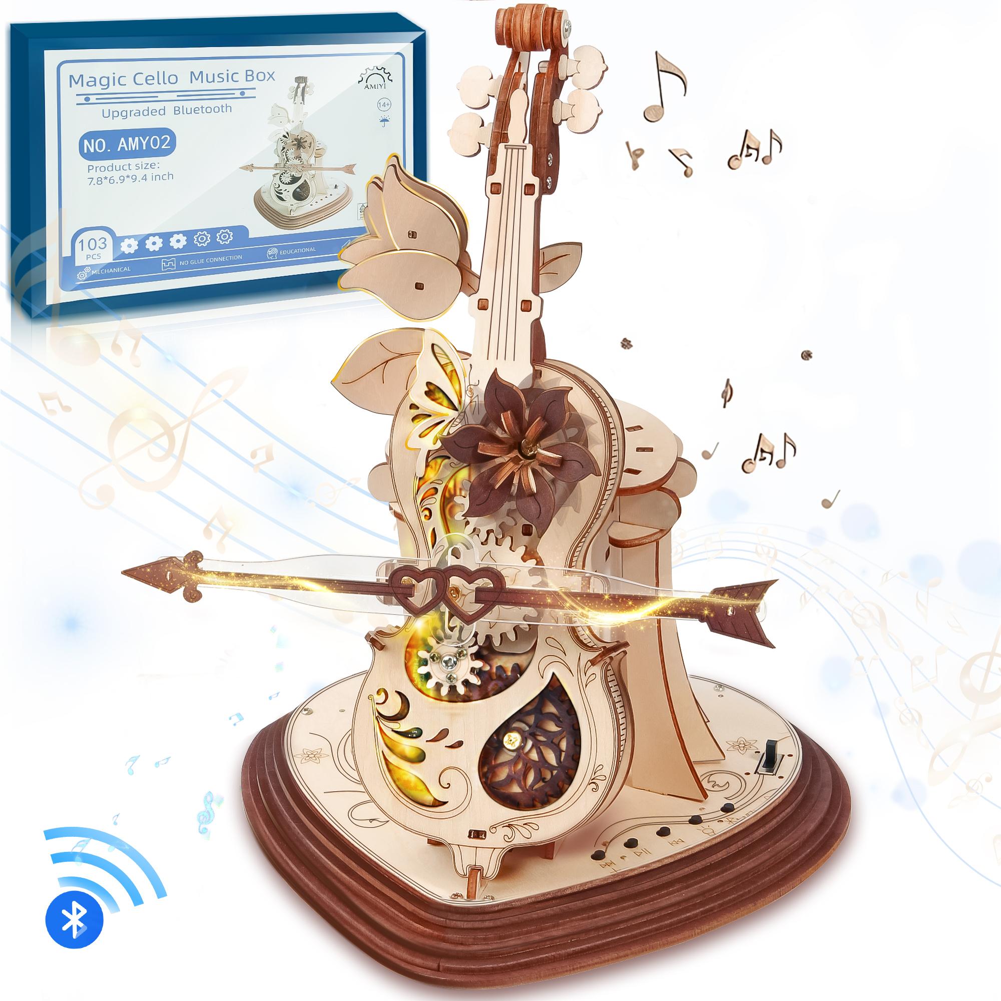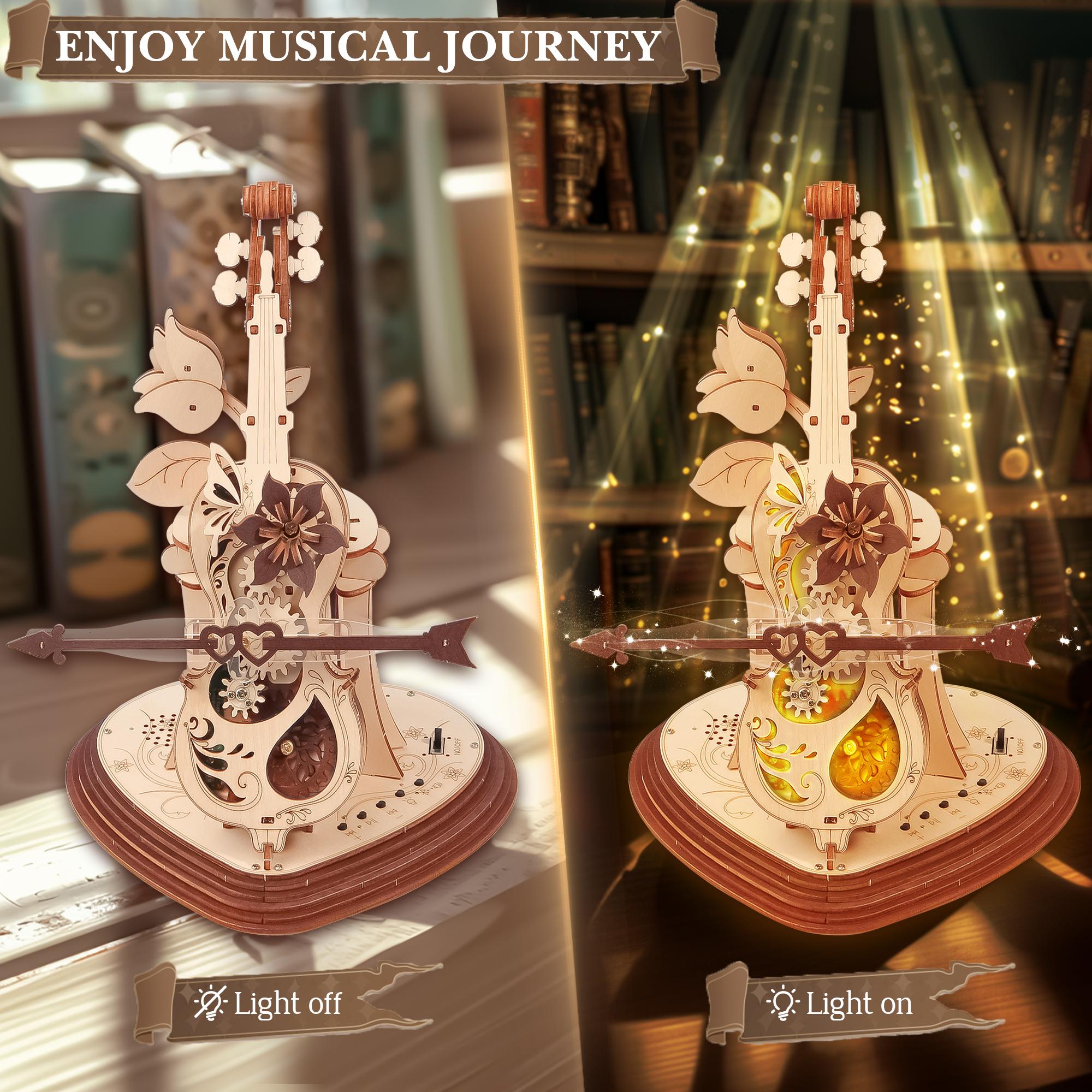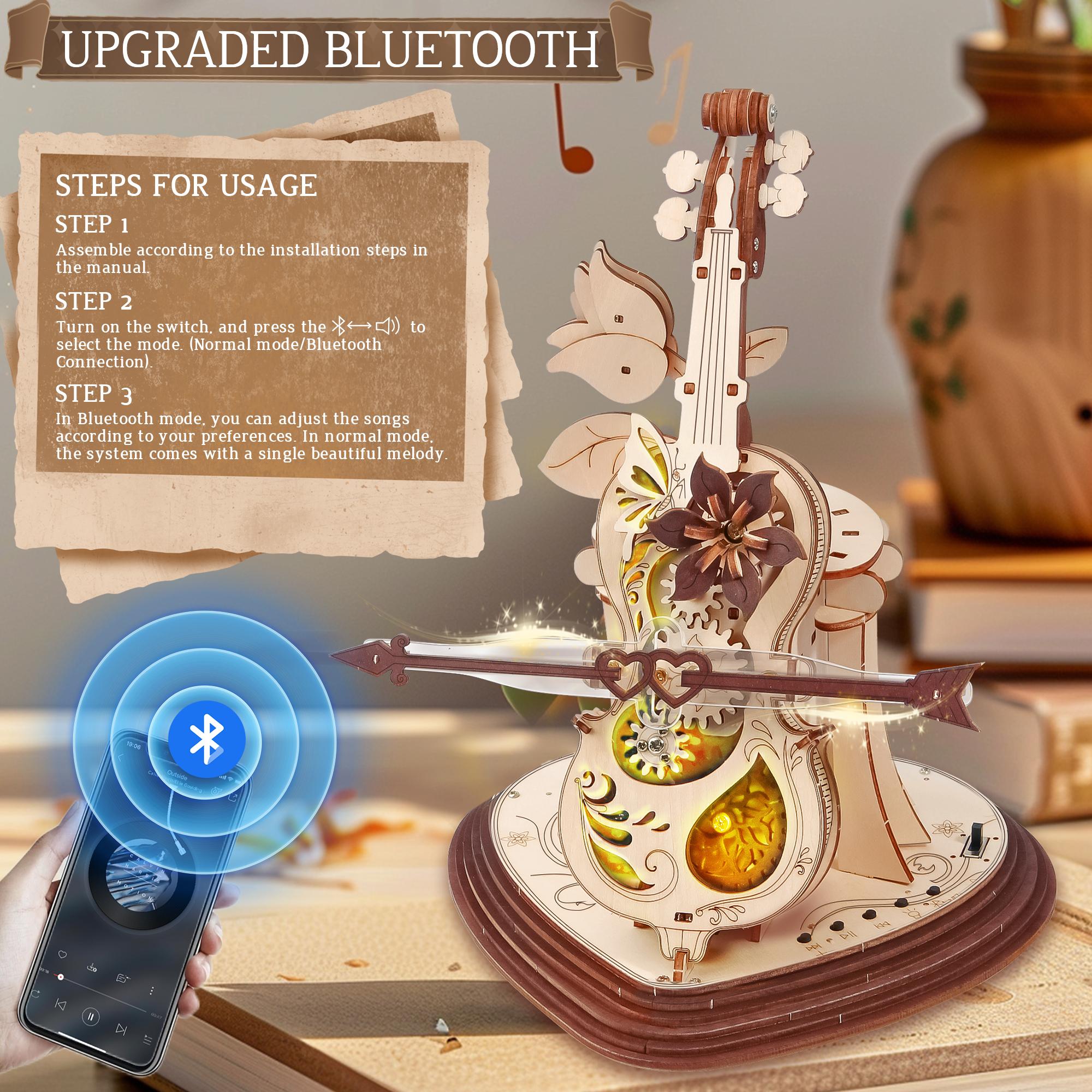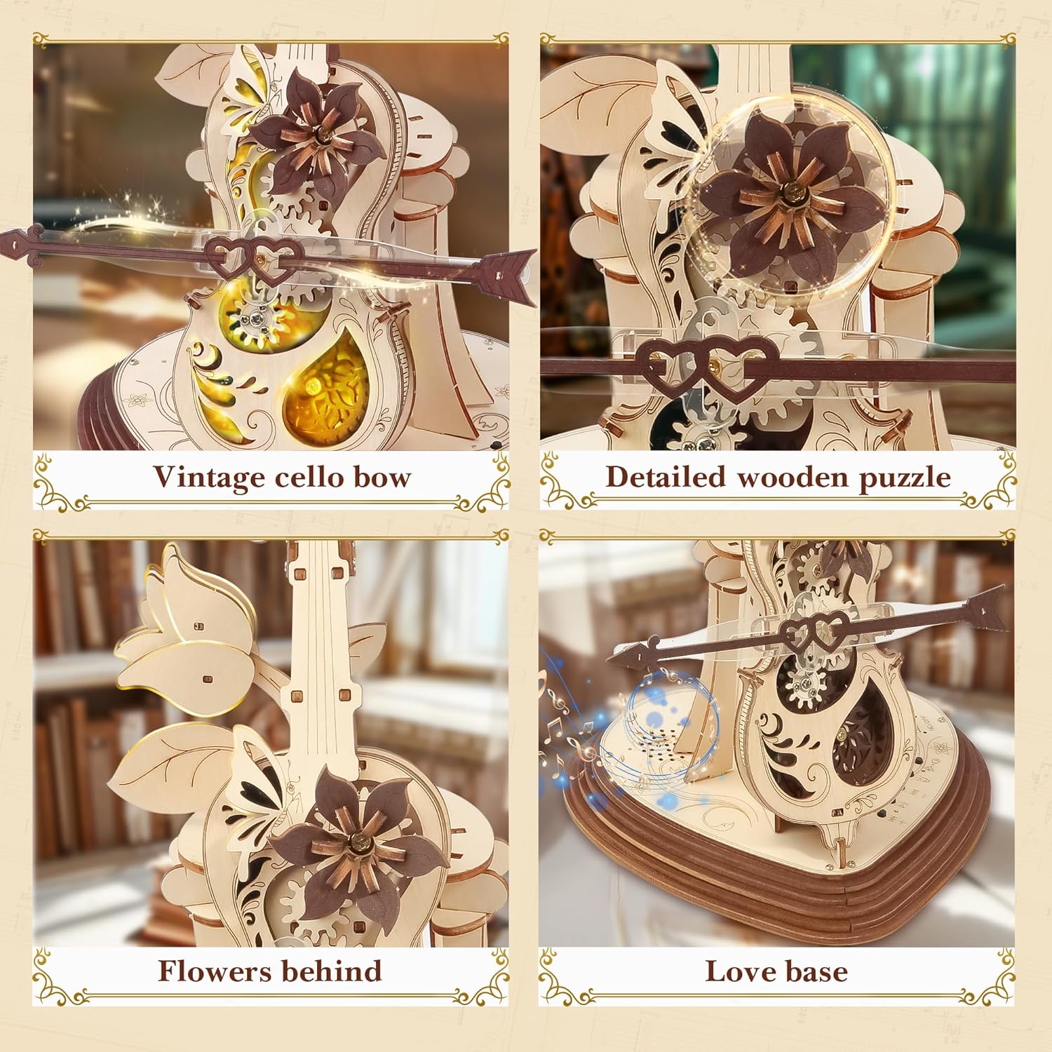 - Mechanical Music Box: No longer a single melody, connect Bluetooth and listen to the music you want. The wooden puzzle allows song switching, pause/play. When the music sounds with the lights, gear overlap and mechanical drive, the love arrow bow plays slowly, simulating the real performance of the cello.
