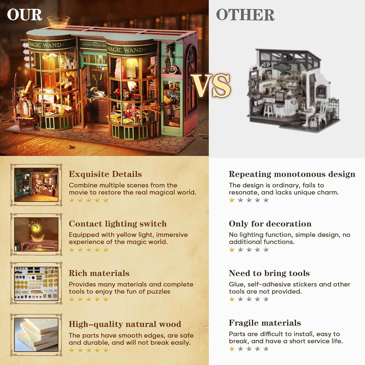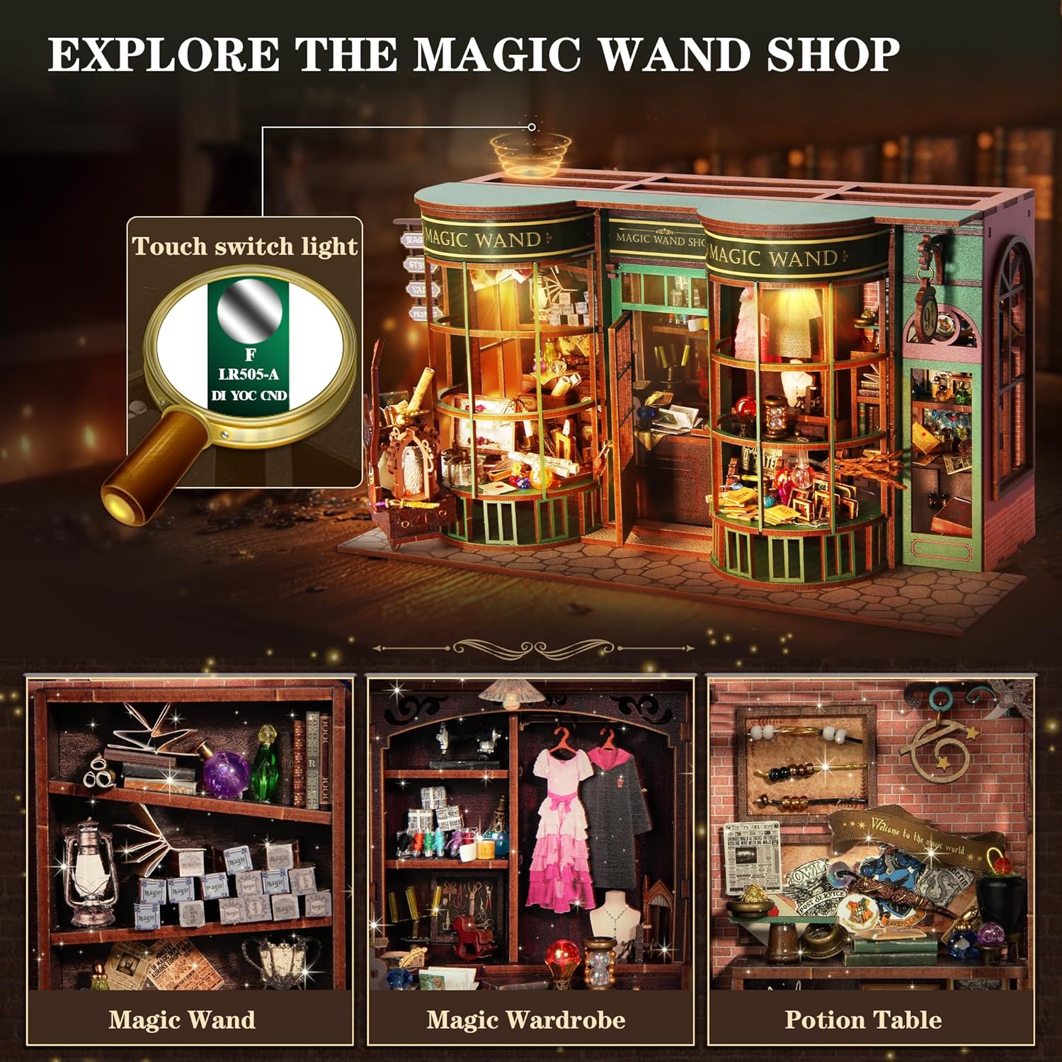 - Unique Creative Design: The dollhouse kit combines many classic scenes from movies. It restores the most realistic magic world. Equipped with comfortable yellow light. Create a mysterious atmosphere and provide an immersive experience. The contact switch allows you to feel the charm of magic at all times.