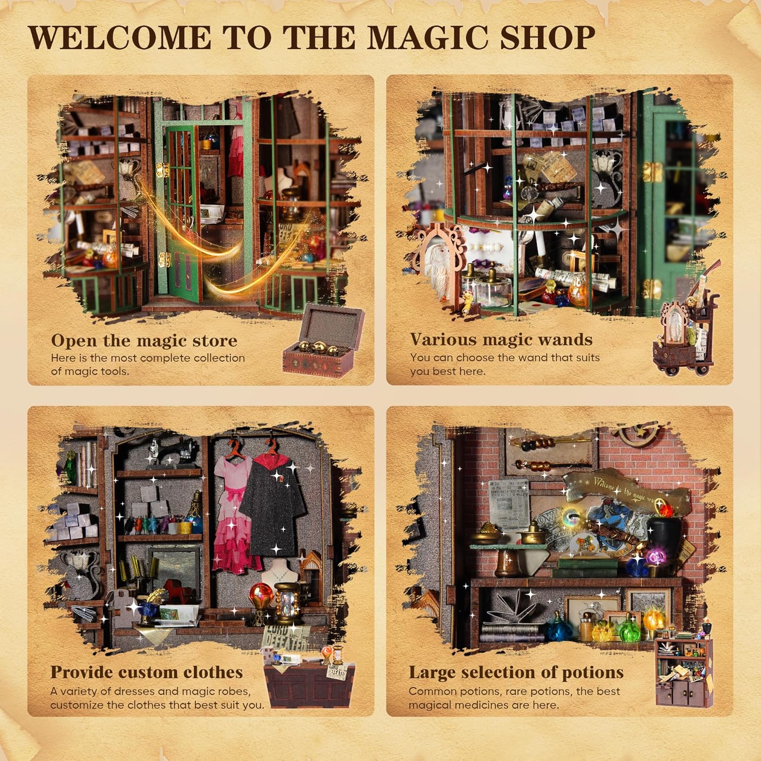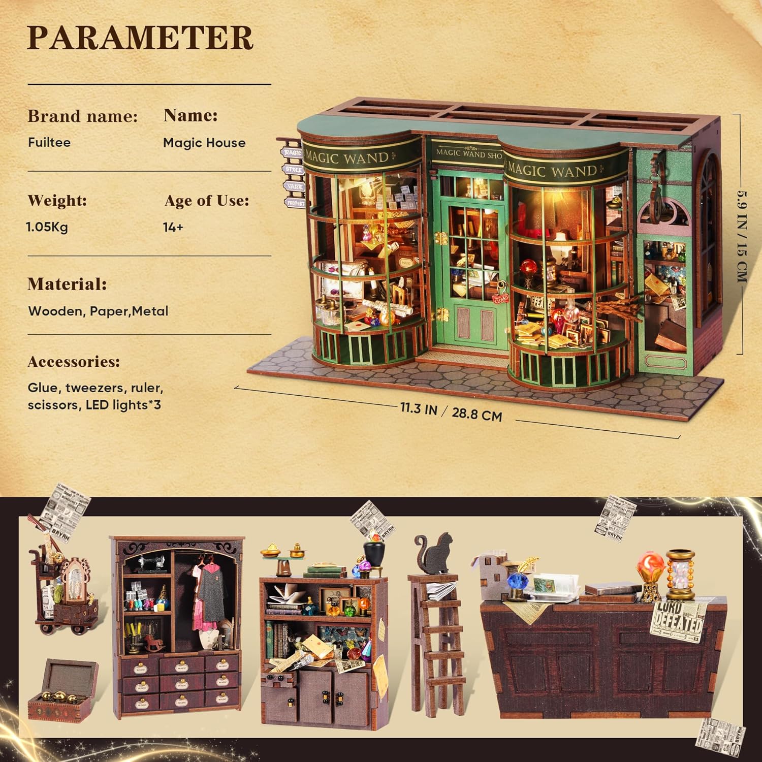 - Perfect Decoration & Great Gift: This 11.3*5.1*5.9in doll house kits for adults perfectly presents the interior structure of the entire wand shop. The ingenious design and exquisite details are amazing. It is an indispensable collection and decoration for magic lovers, model collectors and teenagers. It is the best gift choice for birthdays, Christmas and other festivals!