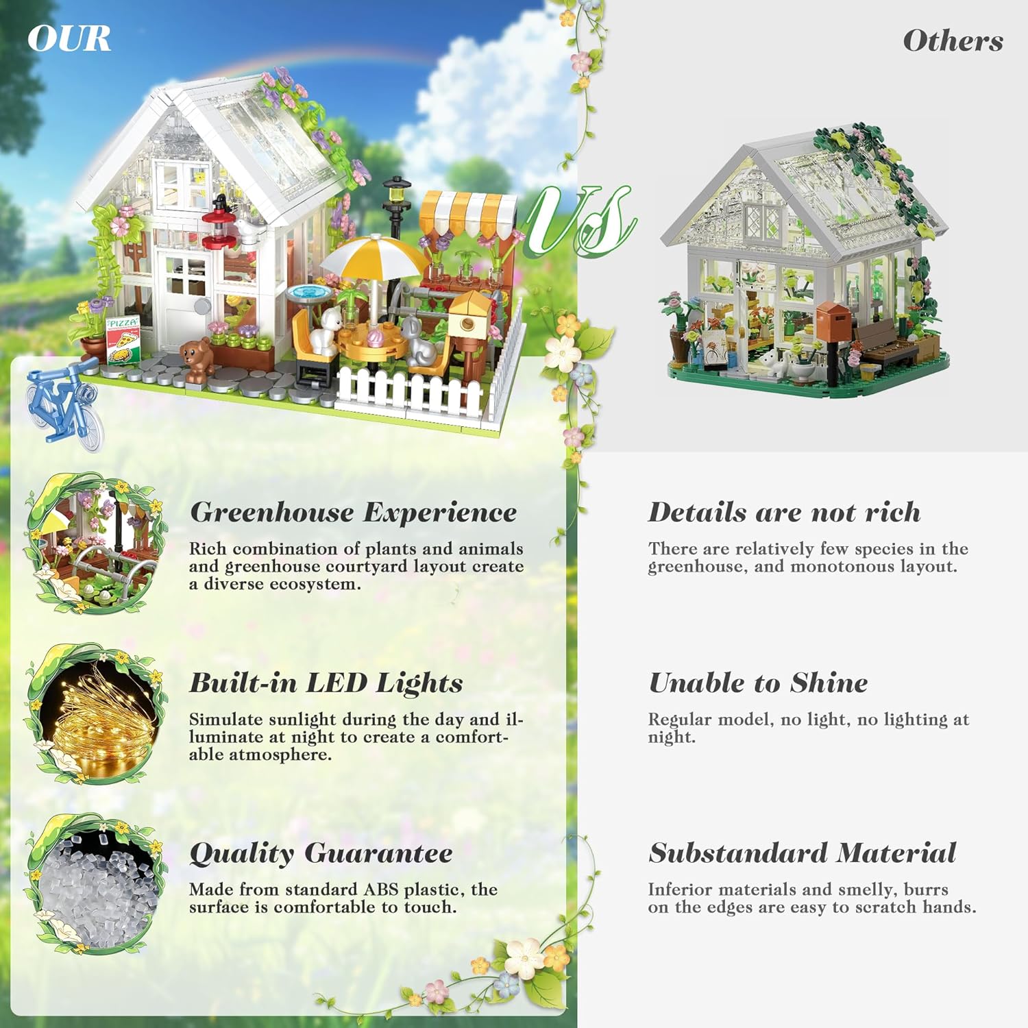 - Customizable DIY Natural Landscape: Our flower house building set feature a clever roof and door design that opens smoothly.The rich combinations of plants and animals can be freely replaced, flexible and versatile, sparking creativity and allowing you to fully enjoy the diy greenhouse kit experience.
