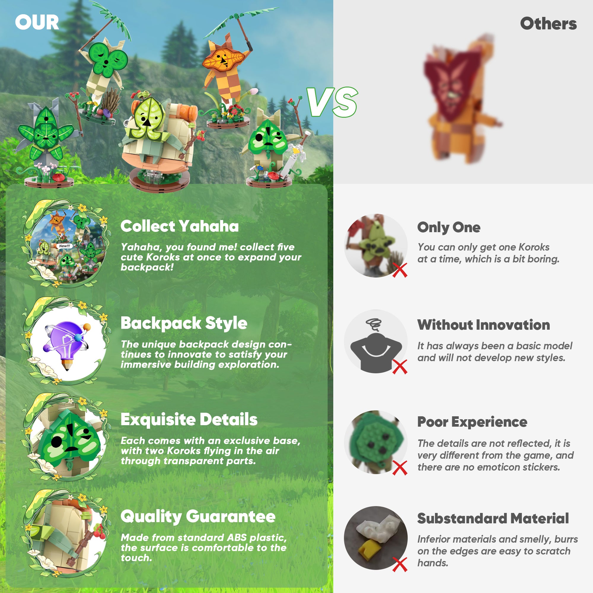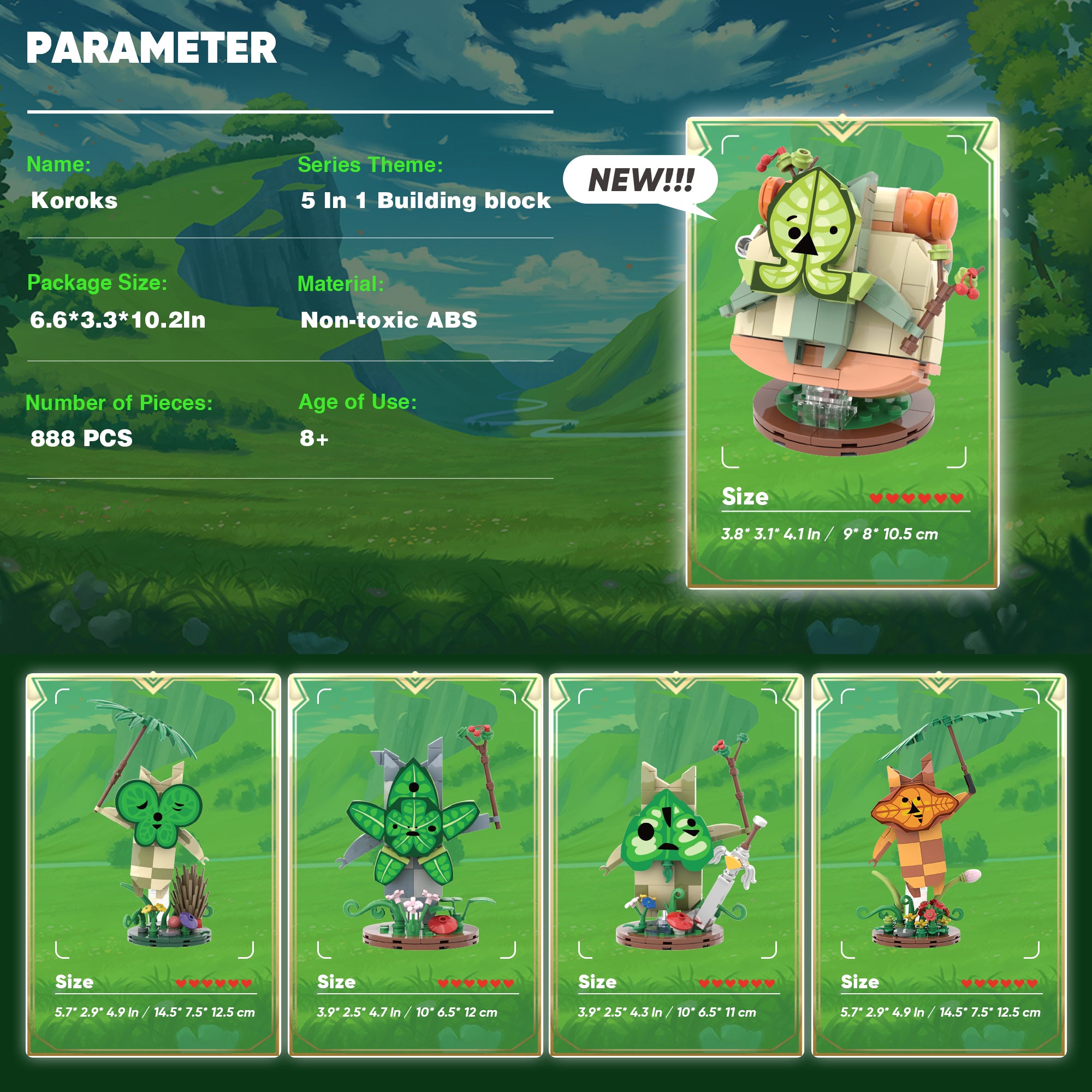 - Game details: The Koroks building block adopts a unique design and restores in the game in the form of building blocks. Every detail has been carefully designed to ensure it's as close to the in-game as possible. Let's follow the protagonist's footsteps and get more Koroks to expand our game backpack!