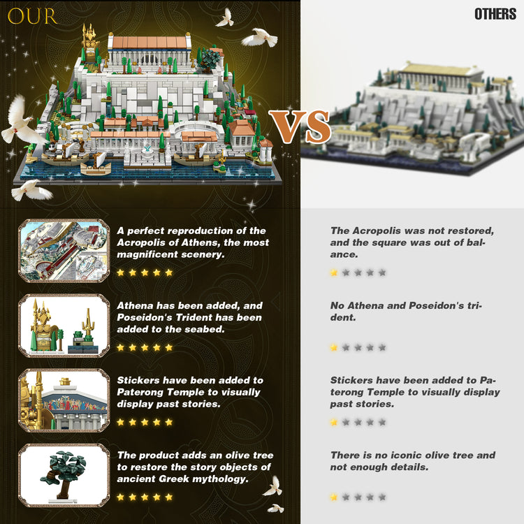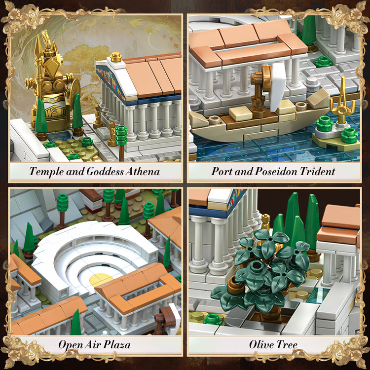 - [Abundant Details] Reconstruction of the Acropolis features such as details about the stickers on the Parthenon, the statue of the goddess Athena, trident, olive tree symbolizing peace,plaza, fountain, port and surrounding area. This landmarks architecture set Visualizes the stories of the past and offers you an immersive tour of the Acropolis. Enjoy a fun and challenging assembly experience for traveling or history with your friends and family!